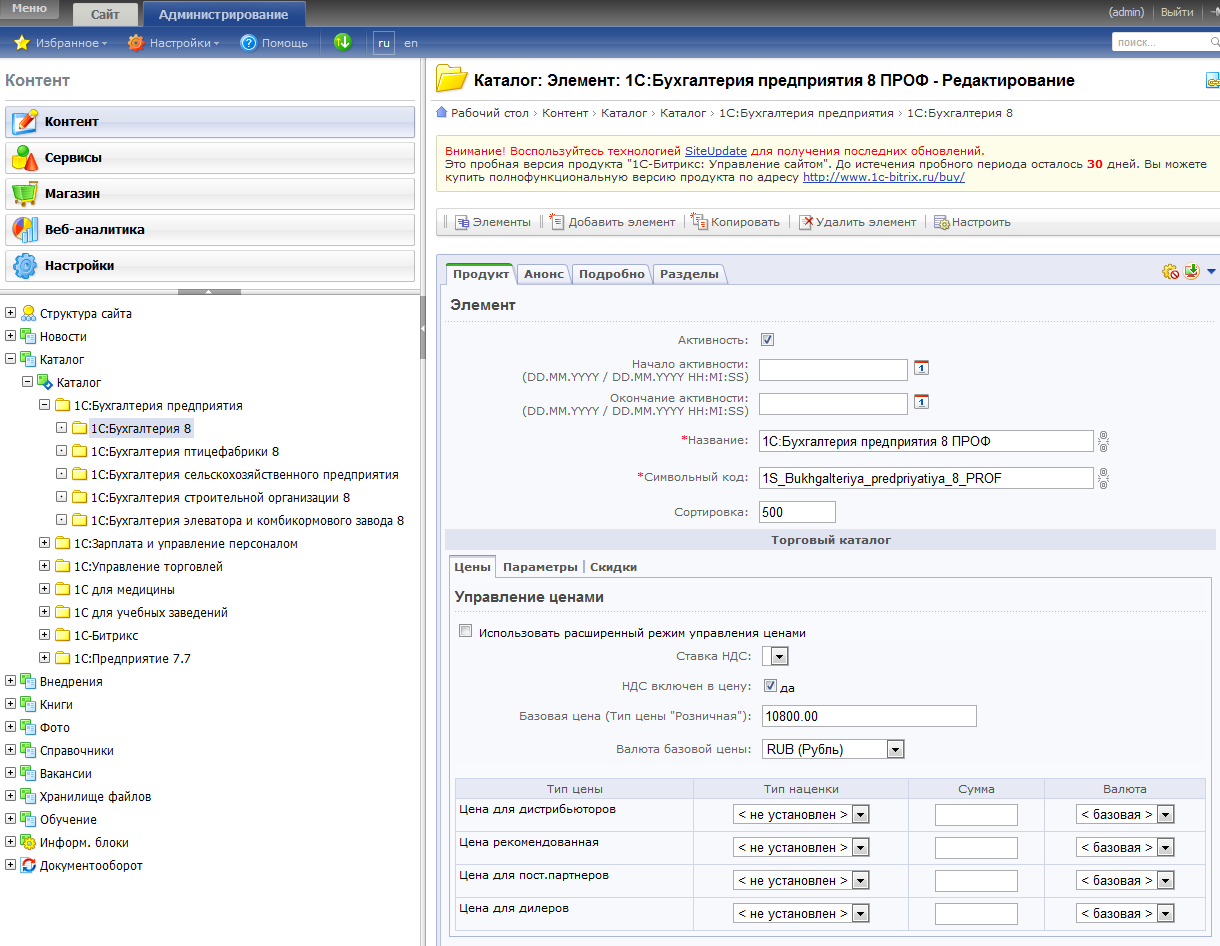 Каталог товаров и услуг интернет-магазина может быть отражен в конфигурации «1С:Предприятие». Для настройки двустороннего обмена между «1С-Битрикс: Управление сайтом» и конфигурацией «1С:Предприятие» (для торговых конфигураций) уже разработан набор штатных процедур. От пользователя требуется только указать необходимые параметры настройки для организации обмена.