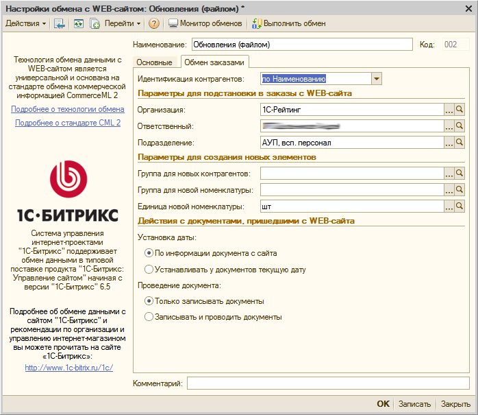 Также, как и для обмена каталогом товаров, в конфигурации «1С:Предприятие» существует возможность настройки двустороннего обмена заказами с «1С-Битрикс: Управление сайтом». Для этого необходимо указать параметры настройки организации обмена: