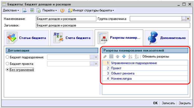 Далее, для элементов справочника «Бюджет» необходимо обновить разрезы планирования показателей и настроить порядок их следования. Порядок следования разрезов определяет вложенность аналитики планирования.