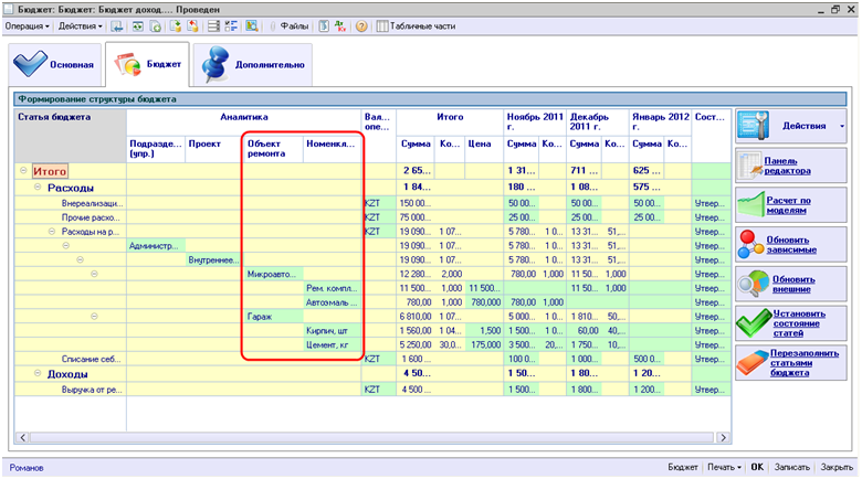 После выполнения всех вышеперечисленных операций можно приступить непосредственно к заполнению документа «Бюджет». Запланируем некоторые суммы на ремонт гаража и микроавтобуса. Укажем выбранные объекты ремонта в соответствующей колонке аналитики. Для ремонта микроавтобуса запланируем два вида номенклатуры: рем. комплект двигателя и автоэмаль, а для ремонта гаража запланируем определенное количество кирпича и цемента. Заполним количество номенклатуры и предполагаемую цену.
