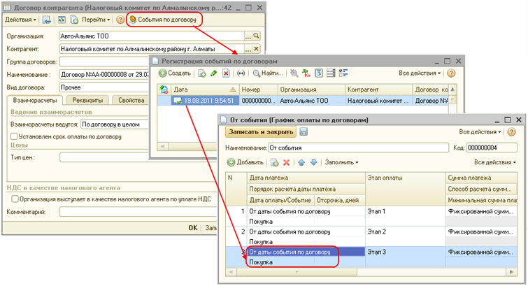 Суть данного механизма заключается в следующем. В системе для каждого договора с помощью специального документа «Регистрация событий договоров» можно регистрировать произвольный перечень событий с указанием даты их наступления. События по закупкам и продажам регистрируются автоматически.
