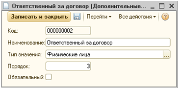 Справочник позволяет хранить неограниченное количество параметров с различными типами значений. Например, для договора можно указать ответственного за исполнение и сумму задолженности по этому договору.