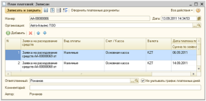 Утверждение сумм расходов по сформированным заявкам в системе осуществляется документом «План платежей». Документ представляет собой список заявок на расходование денежных средств с указанием запланированных сумм и дат оплаты, сумм фактических платежей по заявке.