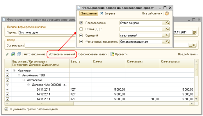 В обработке необходимо задать период, за который будут сформированы заявки, минимальную дату платежа (по данной дате рассчитывается сумма пени) и, в случае необходимости, задать отбор по организации и контрагенту. Табличная часть обработки автоматически заполнится суммами платежей, рассчитанными за выбранный период.
