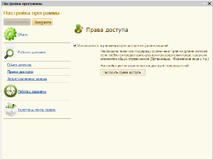 В открывшейся форме настройки в разделе «Работа с данными» укажем пункт «Права доступа», после чего устанавливаем признак Использовать ограничения прав доступа на уровне записей.