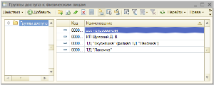 Обработка настройки прав доступа на закладке «Физические лица» работает не с записями справочника Физические лица, а с записями справочника Группы доступа физических лиц (меню Сервис – Пользователи – Группы доступа физических лиц). Это связано с тем, что физических лиц в организации может быть очень много и настраивать доступ к каждому в отдельности бывает трудно. Поэтому легче объединить работников в группы доступа, например «Дирекция», «Рабочие цеха 1» и т.д., после чего дать пользователям доступ к группам доступа физических лиц целиком, а не к отдельным физическим лицам. Поэтому в обработке настройки прав доступа используются именно элементы данного справочника.