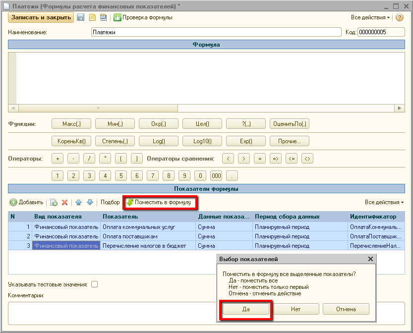 Формула описывается в виде выражения, составленного по правилам встроенного языка платформы 1С:Предприятие. При создании формулы можно использовать как конкретные значения строк и чисел, так и переменные, ссылающиеся на показатели формулы. Для того, чтобы поместить переменную, соответствующую показателю, в формулу необходимо либо ввести с клавиатуры ее идентификатор, либо выделить строку с нужным показателем и затем выбрать команду «Поместить в формулу». Если необходимо добавить сразу несколько показателей, установив между ними операцию сложения, вычитания, умножения или деления, то можно выделить сразу несколько показателей и нажать кнопку «Поместить в формулу». После этого система задаст вопрос о подтверждении действия и предложит выбрать применяемую между этими показателями арифметическую операцию.