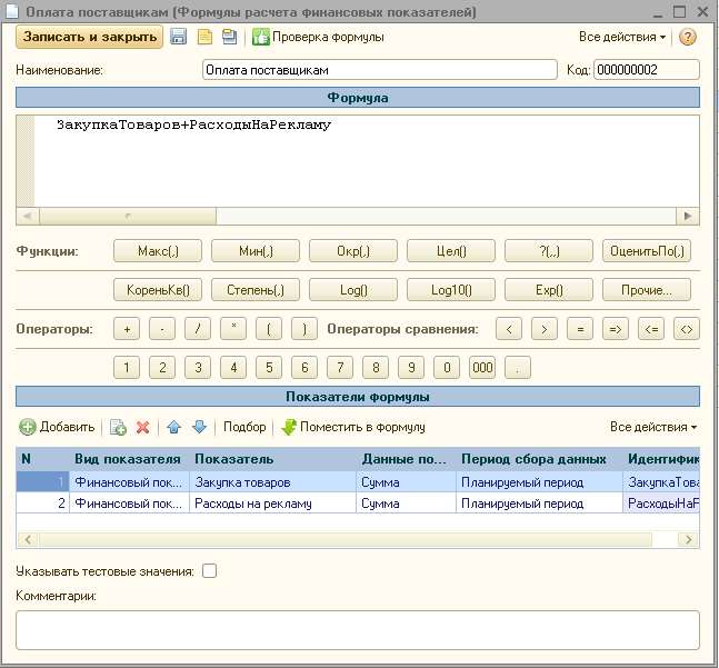 В табличной части «Показатели формулы» перечисляются статьи, которые будут участвовать в расчете итоговой строки.