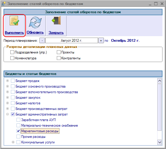 В списке «Бюджеты и статьи бюджетов» обработки выберем статью «Маркетинговые расходы» и нажмем кнопку «Выполнить». Табличная часть будет заполнена строками с выбранной статьей бюджета.