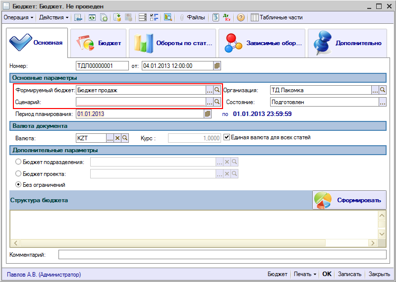 После того, как определены все зависимости статей оборотов можно приступать к формированию бюджетов. Формирование бюджета в прикладном решении «1С-Рейтинг: Управление финансами и бюджетирование для Казахстана» осуществляется при помощи документа «Бюджет». В данном документе фиксируется планируемое движение средств предприятия по всем статьям определенного бюджета за период, продолжительность которого определяется периодичностью и горизонтом планирования сценария, выбранного для бюджета.