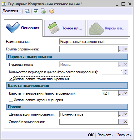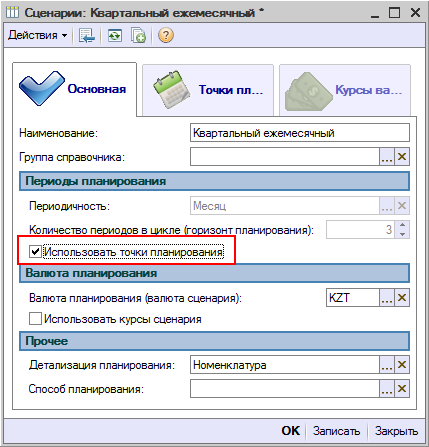 Назовем этот сценарий «Квартальный ежемесячный», укажем горизонт планирования – три месяца и, соответственно, периодичность – месяц. Кроме этого, укажем детализацию планирования по номенклатуре и валюту планирования – тенге. При детализации планирования по номенклатуре обороты по статье бюджета будут вестись с точностью до элементов справочника «Номенклатура» или справочника «Номенклатурные группы». Далее зададим точки планирования.