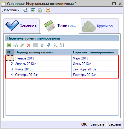 Данный механизм используется в том случае, когда необходимо ограничить выбираемые пользователем периоды планирования в документе «Бюджет» заранее известным списком. Например, если по сценарию планирование ведется на квартал помесячно и необходимо запретить пользователю указать в качестве бюджетного периода «февраль-апрель», и оставить возможность выбирать только периоды, соответствующие кварталам года. В таком случае в перечень будет записан список точек планирования, например «январь-март», «апрель-июнь» и так далее.