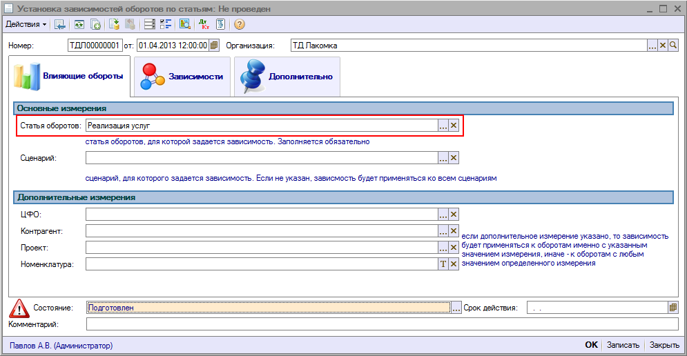 Далее в табличной части «Зависимости» необходимо указать зависимые статьи оборотов, которые будут автоматически формироваться при вводе влияющих.