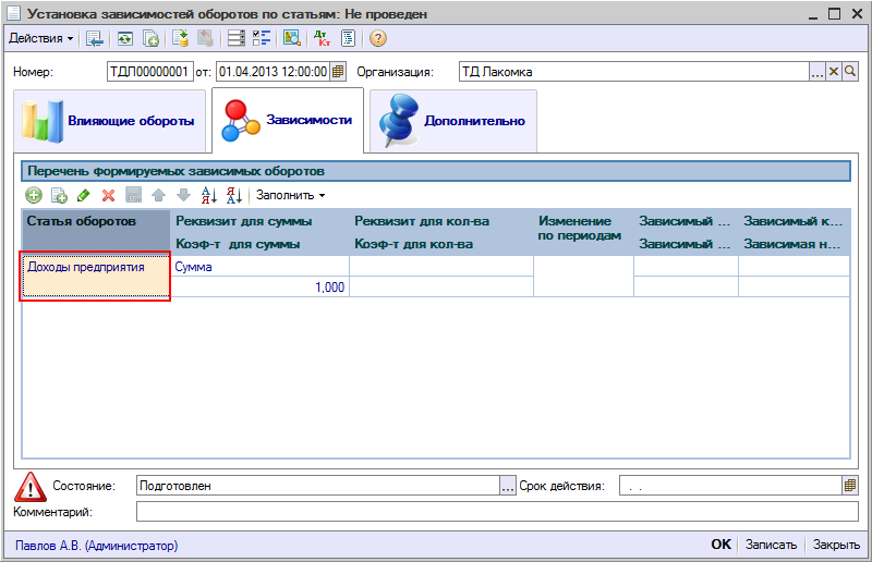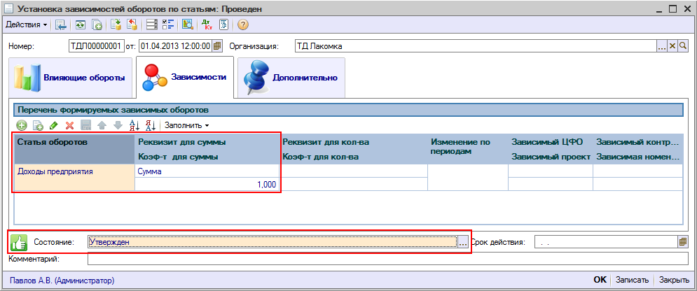 Для зависимой статьи оборотов «Доходы предприятия» укажем реквизит для суммы – «Сумма» и коэффициент для суммы равный «1». После этого для документа установим состояние в значение «Утвержден» и проведем документ.