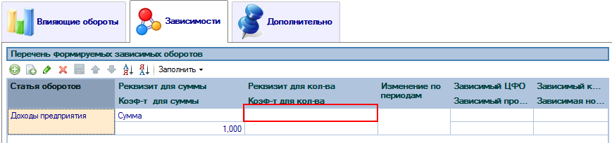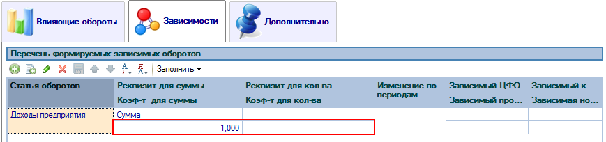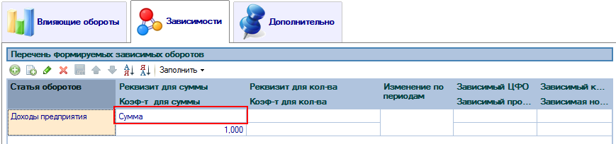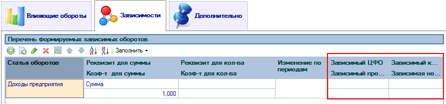 Под зависимостью подразумевается необходимость автоматически формировать обороты по зависимым статьям при регистрации оборотов по влияющим статьям оборотов.