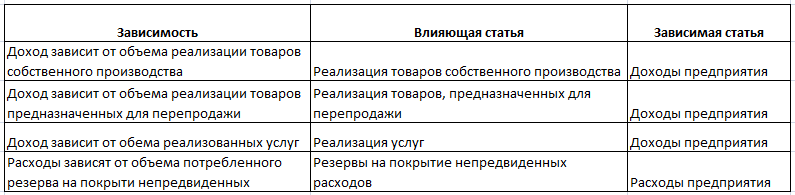 Итак, зададим зависимости для статей оборотов следующим образом: