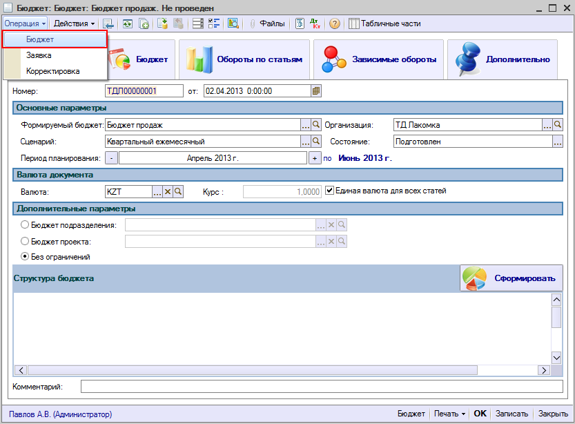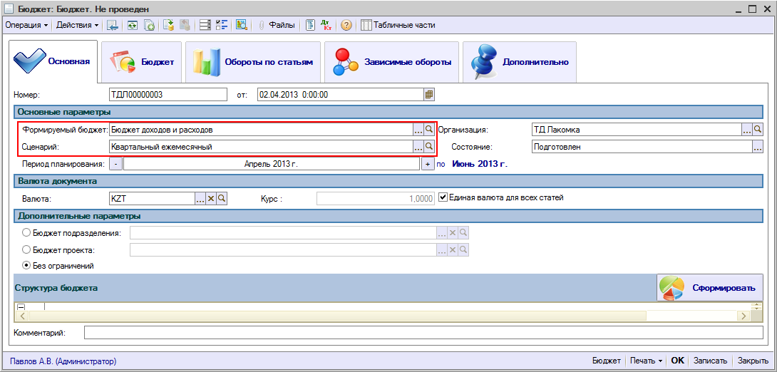 Создадим еще один документ «Бюджет», в качестве формируемого бюджета укажем бюджет доходов и расходов.
