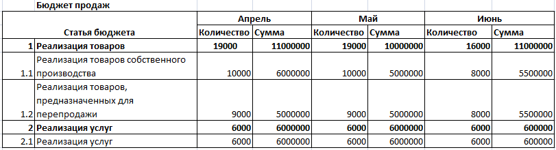 Далее, на закладке «Бюджет» укажем обороты по статьям бюджета в разрезе периодов планирования в соответствии с вышеприведенной таблицей.