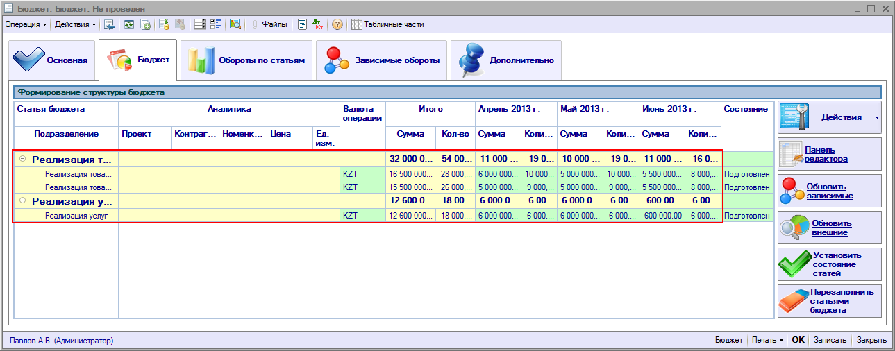 В статье «Построение структуры бюджета предприятия в «1С-Рейтинг: Управление финансами и бюджетирование для Казахстана» было рассмотрено, каким образом организовать структуру бюджета на примере трех видов бюджетов: бюджета продаж, бюджета административных затрат и бюджета доходов и расходов. Для бюджетов был определен перечень статей и определена последовательность формирования, то есть был создан бюджетный регламент. В рамках этой статьи рассмотрим как сформировать перечисленные бюджеты в соответствии с заданной ранее структурой.