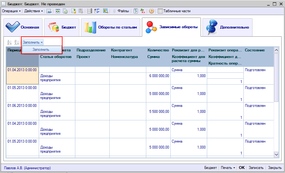 В табличной части «Зависимые обороты» при помощи меню «Заполнить» заполняются обороты по зависимым статьям в соответствии с установленными документом «Установка зависимостей оборотов по статьям» зависимостями. В данном случае от статей бюджета продаж зависит статья бюджета доходов и расходов «Доходы предприятия».