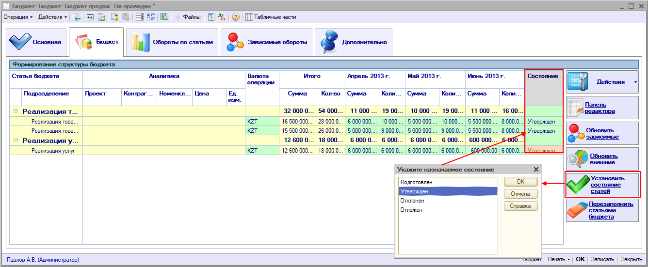 После того, как заполнены все обороты по статьям необходимо в табличной части «Бюджет» для каждой статьи установить состояние «Утвержден». Это можно сделать при помощи кнопки «Установить состояние статей», по нажатию которой выбранный статус будет установлен для всех статей текущего бюджета. В данном случае, в рамках рассмотрения документа «Бюджет», реквизит «Состояние» мы установили вручную, но при использовании подсистемы согласования и утверждения документов реквизит «Состояние» в документах по бюджетированию будет заполняться автоматически. Более подробно о механизмах данной подсистемы можно узнать из статей «Быстрая настройка маршрута согласования документов в прикладном решении «1С-Рейтинг: Управление финансами и бюджетирование для Казахстана» и «Прохождение документа по маршруту согласования в конфигурации «1С-Рейтинг: Управление финансами и бюджетирование для Казахстана».