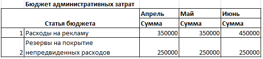 Аналогичным образом создадим бюджет административных затрат в соответствии со следующей таблицей: