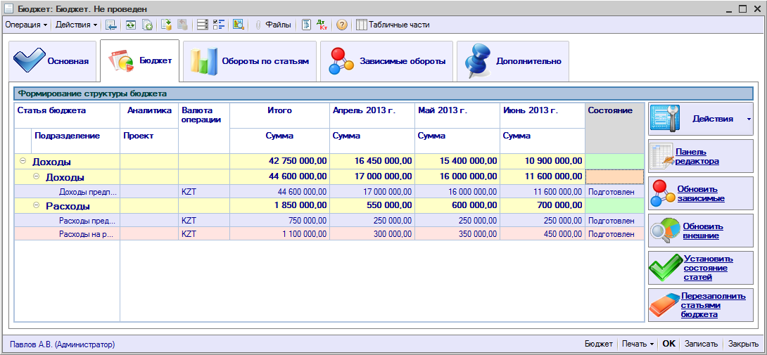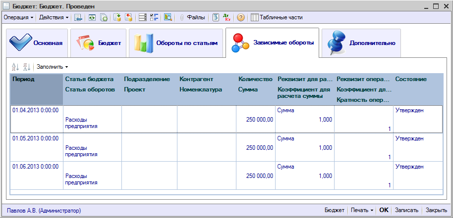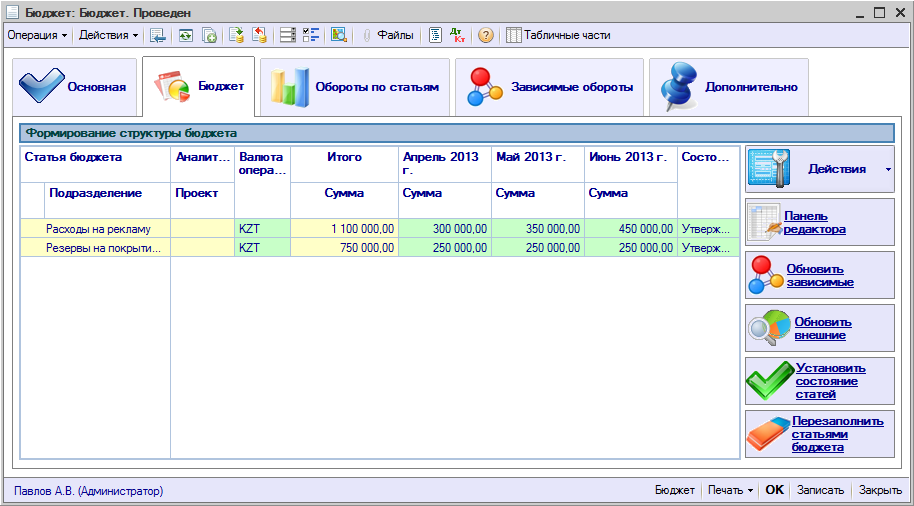 После этого обороты по статьям бюджета необходимо утвердить, как это было сделано с предыдущим бюджетом, и провести документ.