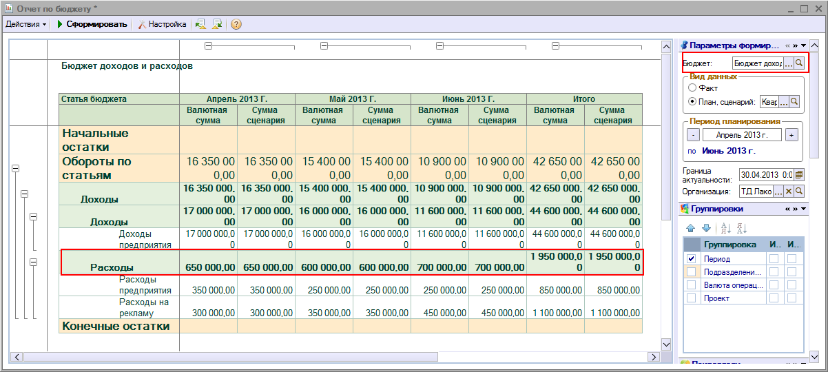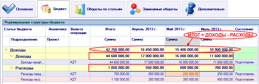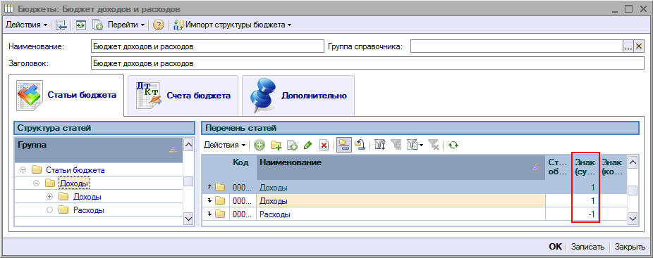 То есть, итоговая строка равна сумме оборотов по группе статей «Доходы» и «Расходы» с учетом знаков, следовательно, так как для группы статей расходов задан знак «минус», то по арифметическим правилам итог будет равен «Доходы» - «Расходы».