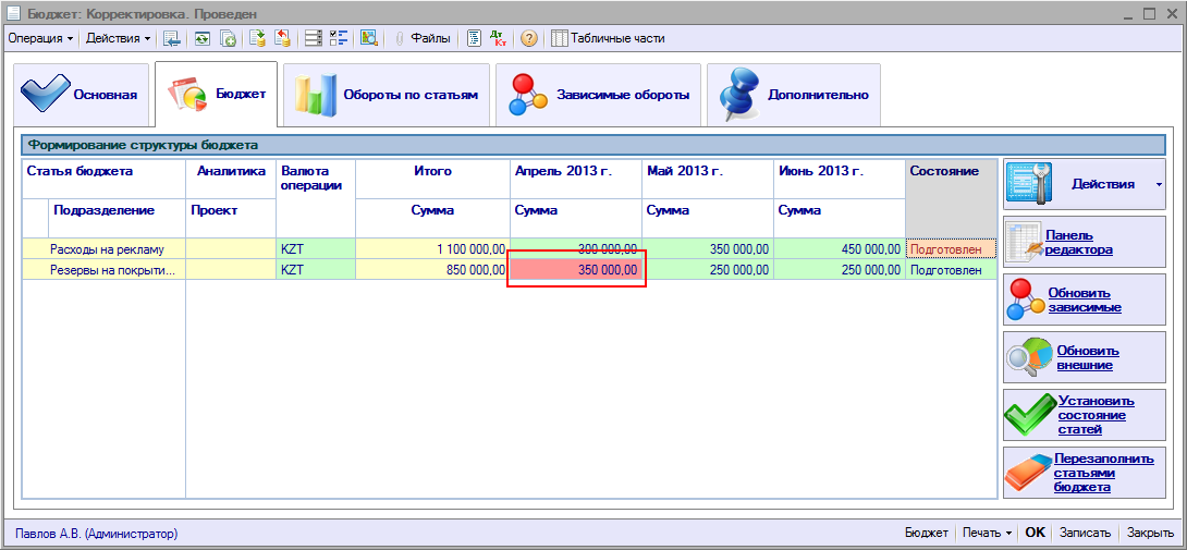 Для того, чтобы внести корректировки в бюджет и при этом сохранить изначальный вариант сформированного и утвержденного бюджета, необходимо ввести новый документ, но уже с видом операции «Корректировка». Заполнение табличных частей документа происходит аналогично формированию бюджета. При этом, обороты по статьям заполняются автоматически актуальными на текущий период данными сформированного бюджета. Те ячейки, значение которых было скорректировано, выделяются красным цветом.