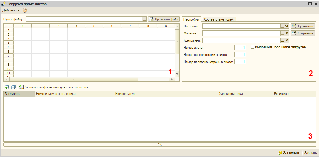 Форма обработки «Загрузка прайс-листов поставщиков» включает в себя следующие функциональные области: