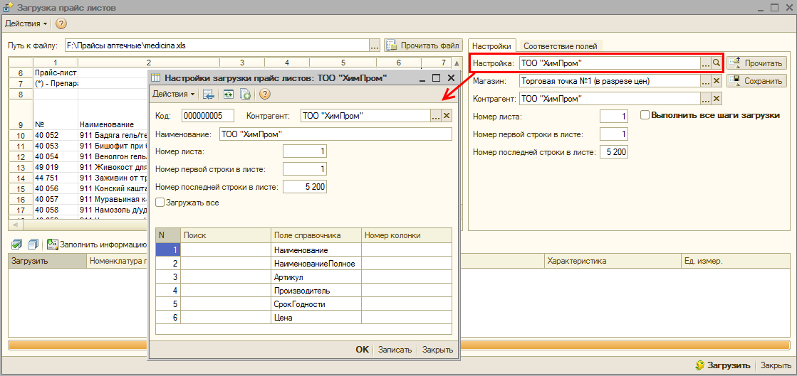 - Область настройки загрузки прайс-листа