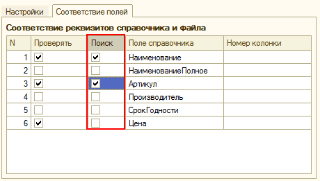 Далее необходимо определить поля, по которым выполнится поиск и сопоставление информации из загружаемого прайс-листа с информацией из базы данных. Для полей поиска автоматически устанавливается флаг «Проверять». В качестве полей для поиска можно использовать, например, поле «Артикул» или «Наименование».