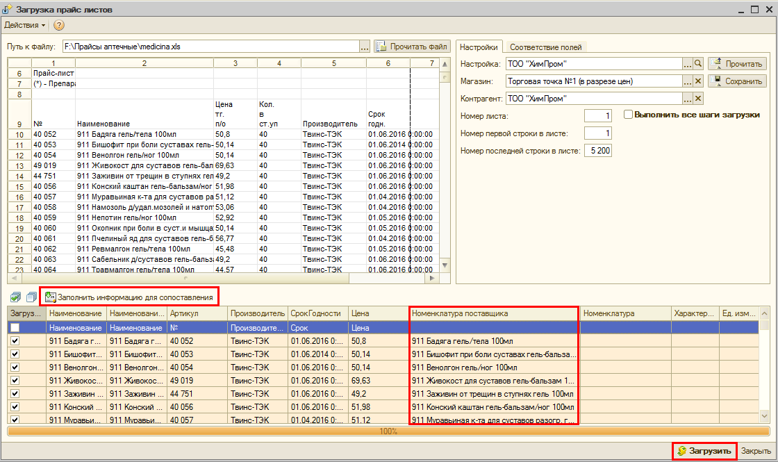 - Область загрузки информации из прайс-листа