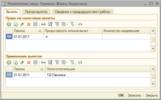 на закладке «Вычеты» необходимо указать право на налоговые вычеты (период, с которого будет действовать вычет по ИПН, и признак предоставления вычета) и заполнить табличную часть «Применение вычетов» (значения «период» и «налогоплательщик»).