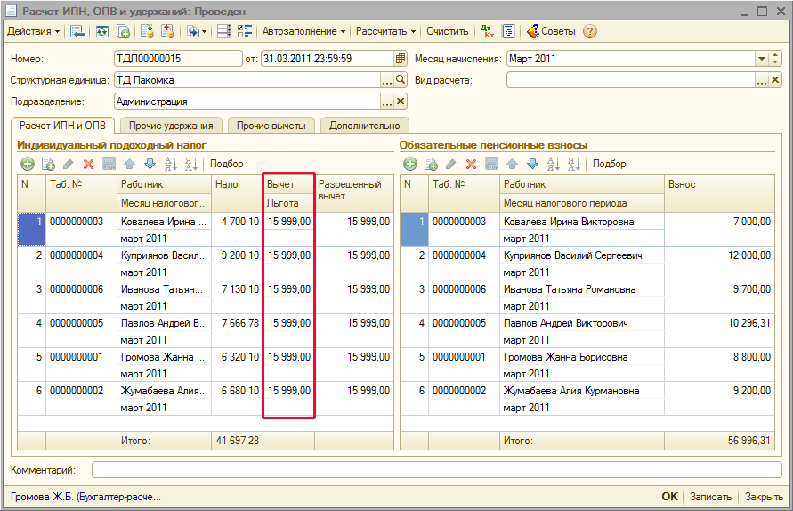 Тогда при заполнении документа «Расчет ИПН, ОПВ и удержаний» при расчете ИПН работнику будет предоставлен вычет в размере 1 МЗП.