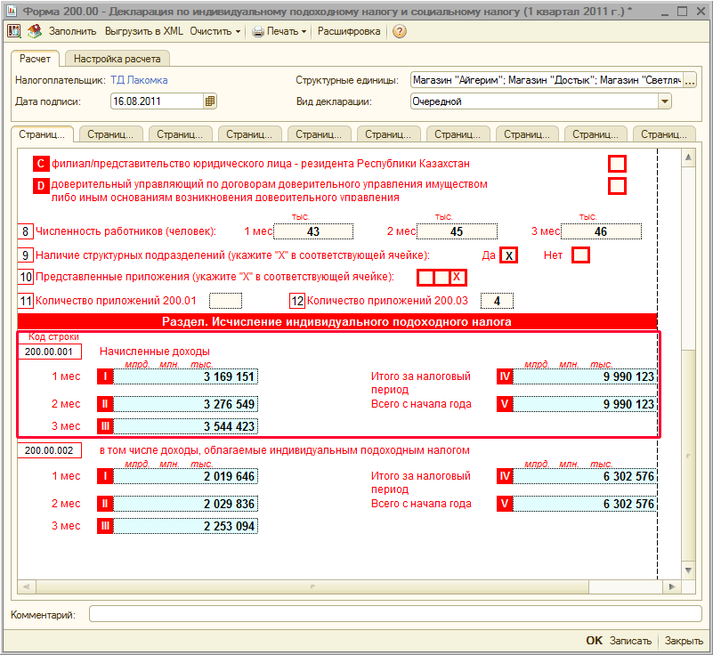 Начисленные доходы работника отразятся в строке 200.00.001 формы 200.00 «Декларация по ИПН и СН».