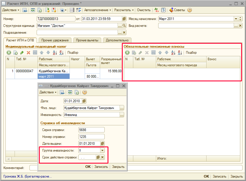 При заполнении и расчете документа «Расчет ИПН, ОПВ и удержаний» данному работнику будет предоставлена льгота по инвалидности, в размере, определенном в регистре сведений «Регламентированные расчетные показатели». При этом если работник имеет I или II группу инвалидности без окончания срока действия справки (инвалидность установлена бессрочно), то в соответствии с законодательством РК, обязательные пенсионные взносы с работника удержаны не будут.