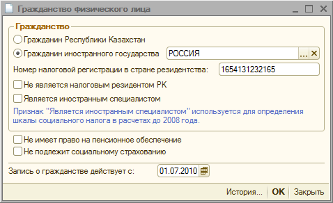Чтобы настроить учет ИПН для работников-граждан других государств, но при этом имеющих вид на жительство в РК, в карточке физического лица в графе «Гражданство» нужно установить признак «Гражданин иностранного государства», выбрать страну из «Классификатора стран мира», указать номер налоговой регистрации в стране резидентства (при его наличии).