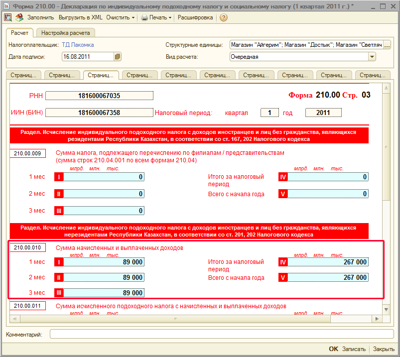 Тогда данные по начисленным доходам и рассчитанным налогам с заработной платы будут отражены в форме 210.00 в соответствующих строках. Так, например, начисленные доходы будут отражены в строке 210.00.001 в разделе «Исчисление ИПН с доходов иностранцев и лиц без гражданства, являющихся резидентами РК в соответствии с 167, 202 НК РК» формы 210.00.