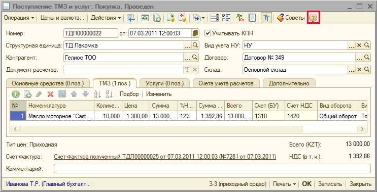 Важно! Для отражения поступления ТМЗ, услуг и ОС предназначен один документ.