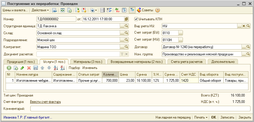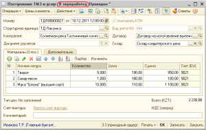 В конфигурации «1С:Бухгалтерия для Казахстана» реализован механизм производства, позволяющий вести автоматический учет как принятых, так и переданных в переработку материалов.