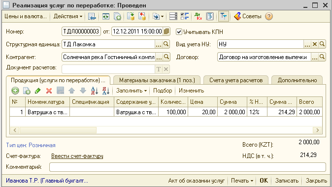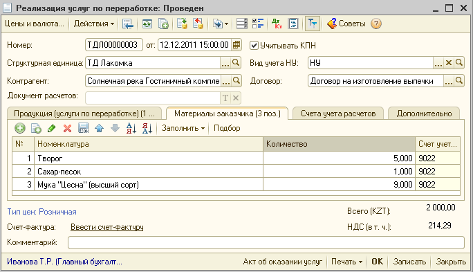 В «шапке» документа указывается контрагент – организация-давалец сырья, которой были оказаны услуги по переработке.