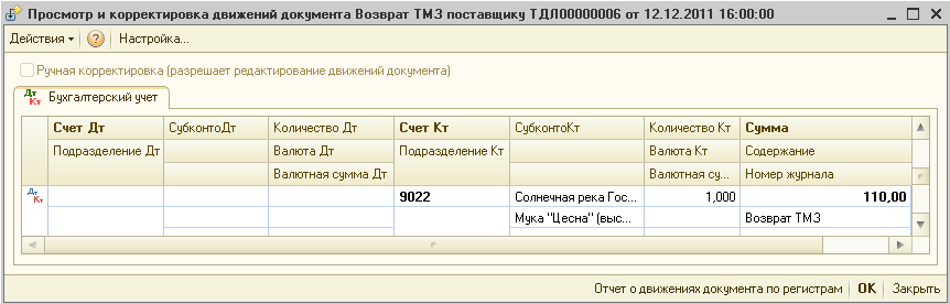 В результате проведения документа формируются односторонние проводки по возврату материалов заказчику по кредиту счета 9022 «Материалы, переданные в производство».
