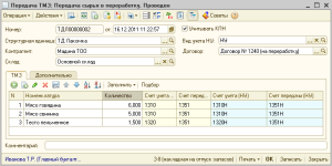 Шаг 1: Операцию по передаче собственных материалов организации-переработчику на изготовление продукции из собственного сырья можно отразить с помощью документа «Передача ТМЗ» с видом операции «Передача сырья в переработку» (меню Производство – Передача в переработку (из переработки)).