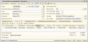 Шаг 2: Отражение стоимости полученной услуги за переработку сырья, получение готовой продукции и отражение данных по использованным материалам осуществляется с помощью документа «Поступление из переработки» (меню Производство – Поступление из переработки).