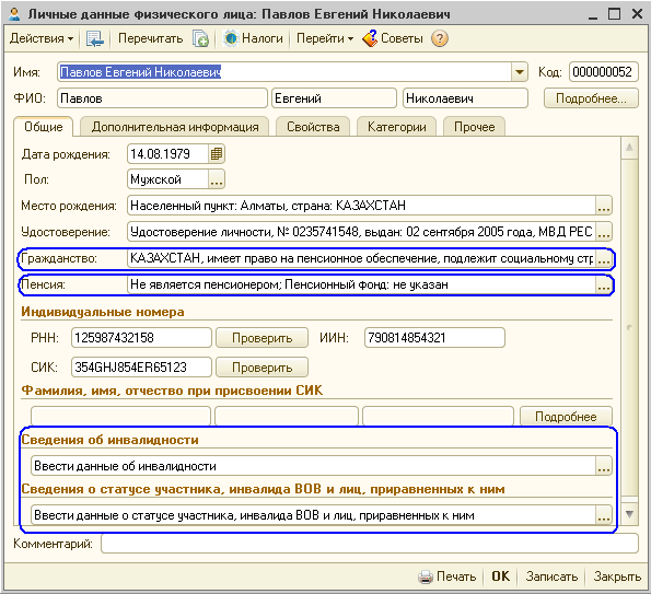 - Для корректного формирования формы 200.00 и расчета ИПН, ОПВ, социальных отчислений с заработной платы необходимо верно отразить информацию в «Личных данных физического лица». Кроме сведений о гражданстве, также отражаются данные о праве работника на пенсионное обеспечение и социальное страхование. Если работник является инвалидом или участником ВОВ (лицом, приравненным к ним) для отражения льгот при налогообложении необходимо отразить соответствующие сведения.