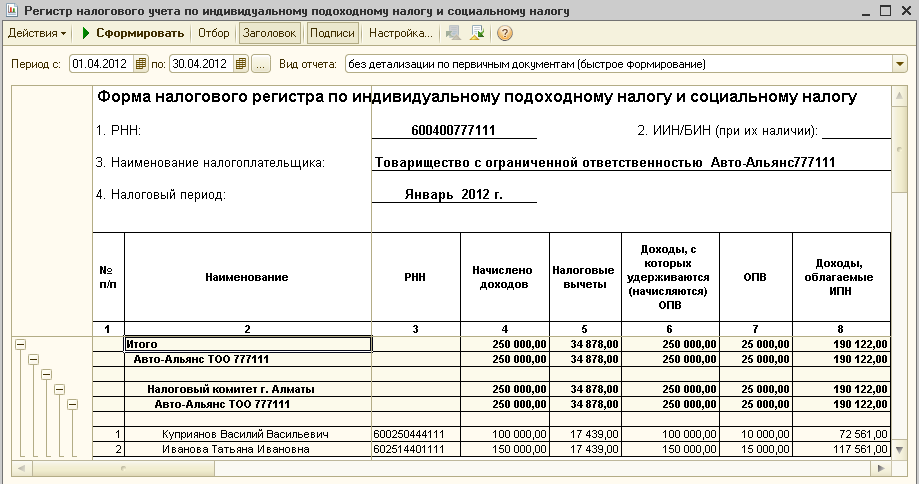 Рассмотрим работу данного признака на условном примере. Допустим, в компании работает два сотрудника: Куприянов В.В. с окладом 100 000 тенге и Иванова Т.И. с окладом 150 000 тенге. Январь месяц 2012 года отработан полностью, заработная плата начислена в полном объеме.