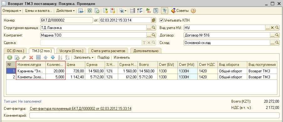 В этом случае табличная часть документа «Возврат ТМЗ поставщику» будет заполнена данными документа «Поступление ТМЗ и услуг». После чего можно будет скорректировать номенклатурные позиции и количество возвращаемого товара.