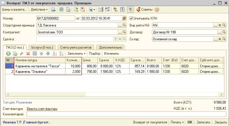 При формировании документа «Возврат ТМЗ от покупателя»табличная часть документа будет заполнена данными документа «Реализация ТМЗ и услуг». Данные табличной части можно откорректировать вручную по номенклатурным позициям и количеству возвращаемого товара.