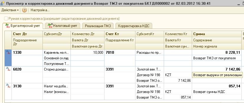 При проведении документа «Возврат ТМЗ покупателю» сформируются проводки по возврату ТМЗ от покупателя, возврату выручки от реализации и возврату суммы НДС.